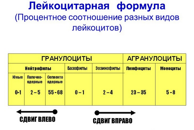 Сдвиг лейкоцитарной формулы указывает на преобладание одной группы нейтрофилов над другими. Расшифровка показателей основывается на лейкограмме и расчете индексе сдвига (ИС) по формуле: ИС = (миелоциты + палочкоядерные нейтрофилы) / сегментоядерные нейтрофилы. При сдвиге влево наблюдается рост палочкоядерных нейтрофилов и появление миелоцитов. Преобладание количества сегментоядерных лейкоцитов указывает на сдвиг вправо. Сдвиг влево указывает на следующие патологии: