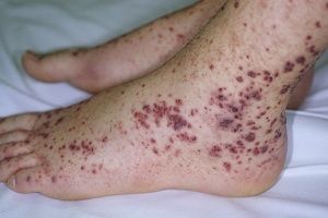 - Геморрагическая сыпь. Она несимметричная и может располагаться на любом участке кожи. Размер их может быть разным.